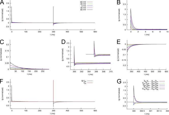 Figure 19. Modeled Ig of WT hERG1 channels in the presence of extracellular Cd2+. (A) Ig in response to the voltage-clamping protocol used in Fig. 12. (B and C) IgON at 0–10 ms and 10–300 ms, respectively. (D and E) IgOFF at 300–310 ms and 310–600 ms, respectively. (F) Gating current (Ig) caused by movement of VSD and current conducted by Cd2+ (ICd) for a 300-ms voltage step to +60 mV, followed by a return to the holding potential of −110 mV. The sum of these two currents produces the gating currents simulated to occur in the presence of Cd2+. (G) Currents underlying the initial 2 ms of IgOFF (300–302 ms). Major contributors to initial IgOFF are Cd2+currents (ICd) related to transitions between S19–S25 and S24–S30 (black) and between S5–S15 and S14–S24 (pink). Currents related to VSD movement (red, green, and blue) have a small contribution to initial IgOFF but dominate after decay of ICd.