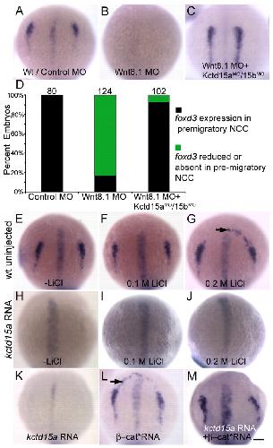 Fig. 3. Kctd15 inhibits the output of canonical Wnt signaling. (A) foxd3 expression in control embryos. (B) Loss of foxd3 expression in wnt8.1 morphants. (C) Injection of Wnt8.1 MO together with Kctd15a/15b MOs rescued foxd3 expression. (D) Quantification of A-C; number of embryos (n) is given above bars. (E-J) foxd3 expression in embryos treated with LiCl (E-G). Arrow in G indicates expanded expression in 26/30 embryos. (H-J) LiCl did not rescue foxd3 expression in kctd15a mRNA-injected embryos (I, 40/40; J, 50/50; numbers indicate embryos with appearance as shown in the figure). (K-M) Inhibition of foxd3 by kctd15a (K) was rescued by β-cat* mRNA (M, 41/50 showing foxd3 expression in NC domain). β-cat* mRNA alone induced ectopic expression of foxd3 (L, arrow, 25/31). (A-C,E-M) 1-somite stage; dorsal views, anterior towards top. Scale bar: 100 μm.