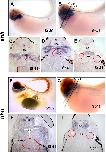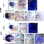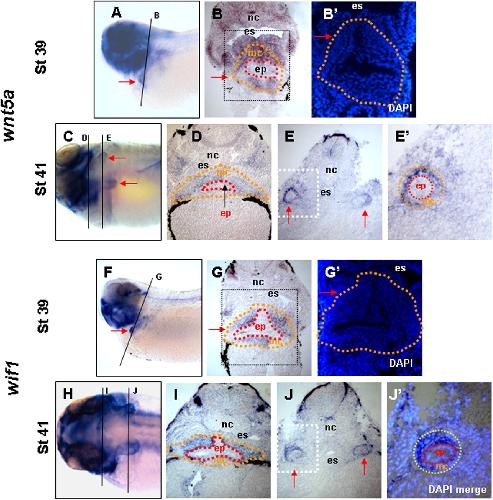 Fig. 3. Expression of wnt5a and wif1 in the mesenchyme of Xenopus lung. (A) WISH image shows wnt5a expression in the lung bud at stage 39. (B) Transverse section of a stage 39 embryo depicts wnt5a expression in the lungmesenchyme. (Bâ²) DAPI stained section for the boxed region in (B) to better depict lung structure (outlined). (C) Stage 41 WISH shows wnt5a expression in the lungs. (D and E) Expression of wnt5a in the lungmesenchyme revealed by transverse section shows high expression in the laterallung tubes. (Eâ²) The magnified image of the boxed region in (E) indicates that wnt5b expression is restricted to the mesenchyme. (F) wif1 is expressed in the lung bud at stage 39. (G) Transverse section confirms presence of wif1 expression in the lungmesenchyme. (Gâ²) DAPI stained section in the boxed region in (G) to better depict lung structure (outlined). (H) wif1 expression in a stage 41 embryolung is shown in a dorsal view. (I and J) Transverse section of a stage 41 embryo illustrates wif1 expression in the anterior and posteriorlungmesenchyme. (Jâ²) Merged bright field and DAPI image of the boxed region in (J) shows wif1 expression in the mesenchyme. Red arrows indicate lungs. Abbreviations: es, esophagus; nc, notochord; ep: epithelium; mc: mesenchyme.