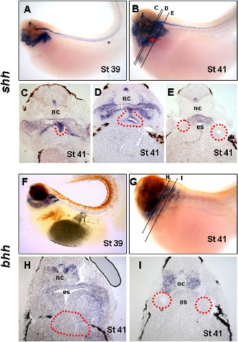 Fig. 4. Expression of shh and ihh in early Xenopus lung development. (AâE) WISH detection of expression of shh. (A) WISH shows absence of shh expression in the lung bud at stage 39. (B) shh expression at anterior part of lungs at stage 41. Transverse section shows the expression of shh in the anterior (C) and middle (D) part of lungepithelium, but not in posterior (E) epithelium of the lung bud at stage 41. (FâI) WISH detection of expression of ihh. No expression of ihh was detected in the lung bud at stage 39 (F) and stage 41 (G). (H and I) Transverse section indicates lack of ihh expressed in the anterior or posterior part of lungs at stage 41. Red arrows and dotted red circles indicate lungs. Abbreviations: es, esophagus; nc, notochord.