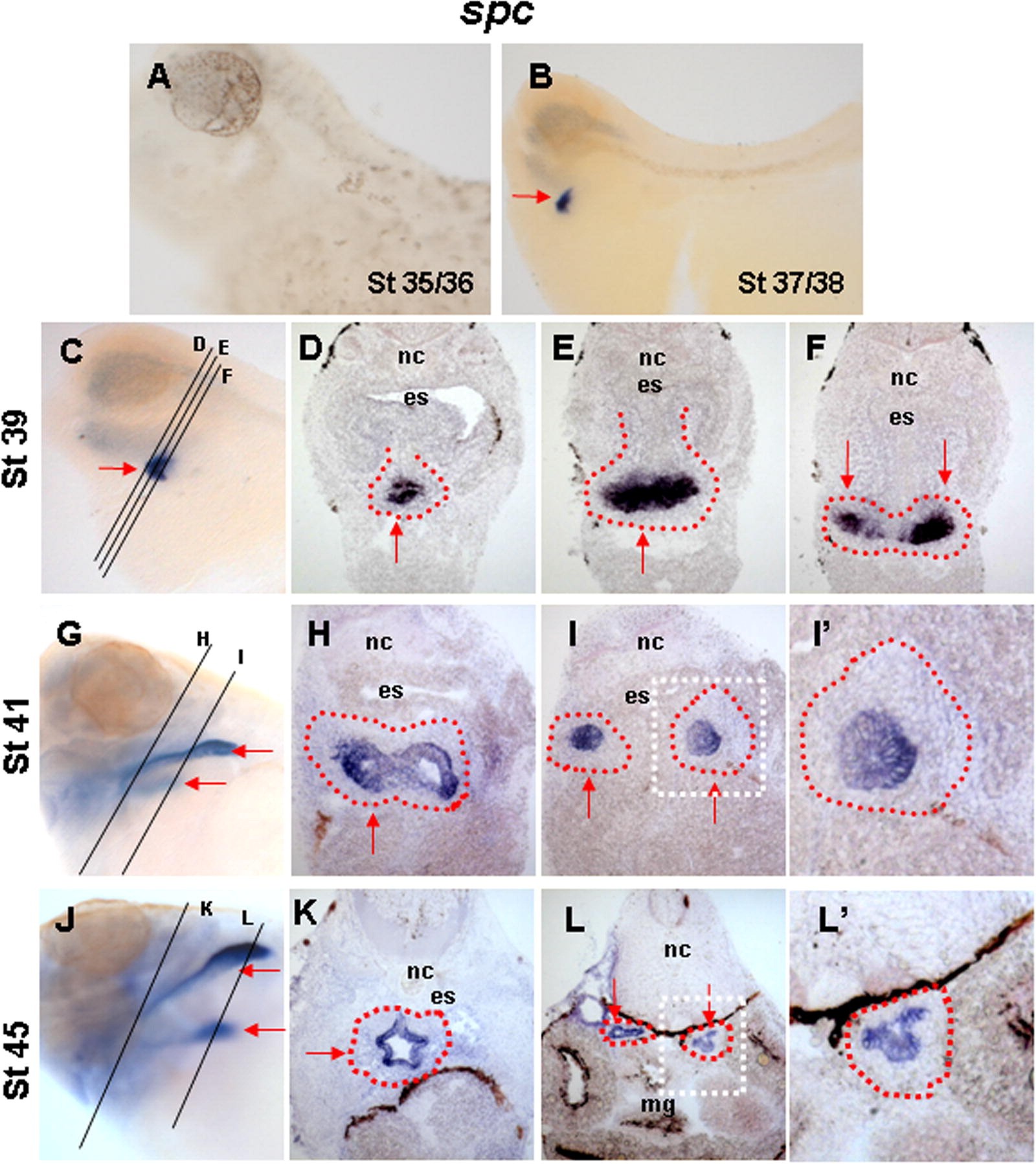 Fig. 1. Expression of sftpc in early lung development of X. laevis. (A) Undetectable sftpc expression at stage 35/36. (B) Earliest expression of sftpc at stage 37/38. (C) sftpc expression is specifically restricted to the lung bud at stage 39. (D, E and F) Cross section of a stage 39 embryo shows sftpc expression in lung buds. Note that the whole lung is located ventral to the esophagus (es). (G) Ventroâlateral view of sftpc expression in lungs at stage 41. (H) Epithelial expression of sftpc in the anterior part of lungs at a point just before the separation of the two lung tubes. (I) Epithelial expression of sftpc in the two separated posteriorlung tubes. (Iâ²) The image of the boxed region in (I) shows sftpc staining in the epithelium. Note that at this stage, with the elongation of lungs, the posterior parts of the lung tube extended to the dorsal side of the esophagus. (J) Ventroâlateral view of sftpc expression in lungs at stage 45. sftpc is expressed in the lungs anteriorepithelium (K) and posteriorepithelium (L). (Lâ²) The image of the boxed region in (L) shows sftpc staining in the epithelium layer. Note at stage 45, the posterior part of lungs is located dorsal to the midgut. Red arrows and dotted red circles indicate lungs. Abbreviations: es, esophagus; mg, midgut; nc, notochord.
