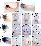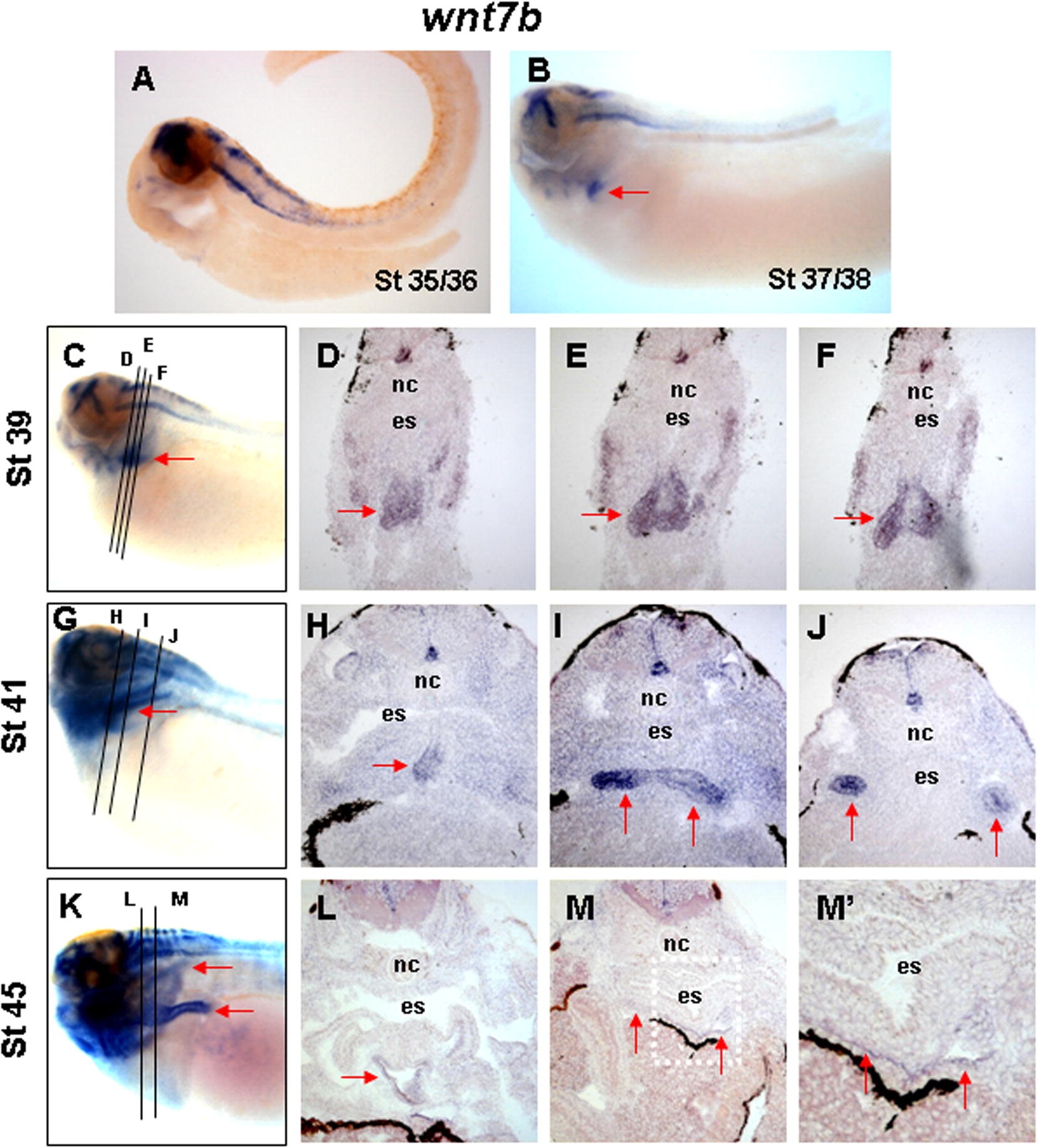 Fig. 2. Expression of wnt7b in Xenopus lungepithelium. (A) wnt7b is not expressed in the lung bud at stage 35/36. (B) The earliest wnt7b expression in the lung bud is detected at stage 37/38. (C) Expression of wnt7b in the lung bud at stage 39. (D, E and F) Transverse sections of stage 39 embryos show wnt7b expression in the entire lungepithelium. (G) wnt7b is expressed in lungs at stage 41. (H, I and J) Transverse sections of the embryo in (G) show that wnt7b is expressed in the entire lungepithelium with stronger expression in the lateral part of lung tubes (I). (K) wnt7b is expressed along the entire lung tube at stage 45. (L, M) Transverse sections show wnt7b expression in the lungepithelium at stage 45. (Mâ²) The magnified image of the boxed region in (M). Red arrows indicate lungs. Abbreviations: es, esophagus; nc, notochord.