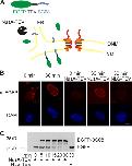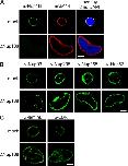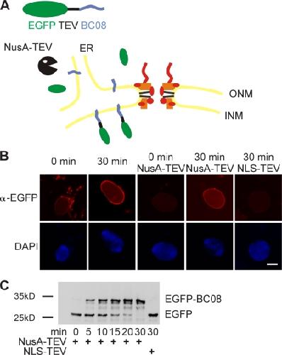 Figure 5. An assay for the transport of membrane proteins to the INM. (A) Schematic representation of the assay. The transmembrane-containing INM protein BC08 is fused to an EGFP domain followed by a recognition site for the TEV protease (top). The fusion protein is reconstituted into liposomes that rapidly fuse with the ER and ONM in the nuclear assembly reaction. INM localization of the reporter can be distinguished from ONM and ER localization by the reporter’s protection from TEV protease fused with a large NusA domain to prevent its diffusion through the NPC. (B) Nuclei were assembled in Xenopus egg extracts. After 50 min, i.e., when a closed NE had formed, proteoliposomes containing the reporter were added. At the indicated time points, buffer, NusA-fused TEV protease, or TEV protease linked to NLS peptides was added. Protease cleavage was stopped after 5 min by fixation, and samples were processed for immunofluorescence and analyzed by confocal microscopy. α-EGFP immunofluorescence is shown in red, and DAPI is shown in blue. (C) Reactions were performed as in B. Protease cleavage was stopped by the addition of SDS sample buffer and boiling. Protease protection of the reporter was analyzed by Western blotting with the position of the uncleaved (EGFP-BC08) and the cleaved reporter with only the EGFP visible indicated. Bar, 20 µm.