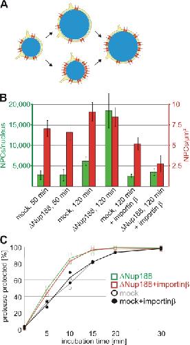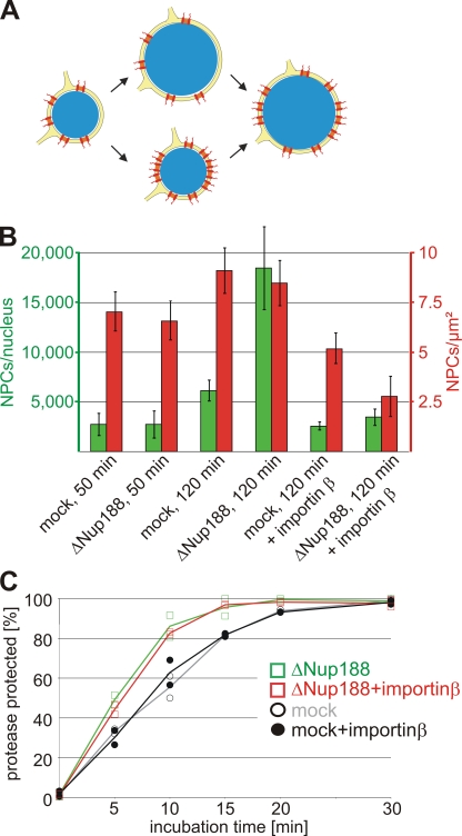 Figure 7. The nuclear growth phenotype and the faster INM targeting are independent of the increased NPC number upon Nup188–Nup93 depletion. (A) Two possible scenarios for the relationship of the nuclear membrane expansion and the increase in NPC numbers upon Nup188–Nup93 depletion. In the top route, Nup188–Nup93 depletion causes a faster growth of the NE, which in turn allows more NPCs (red) to be integrated. In the bottom route, NPC assembly increases on Nup188–Nup93-depleted nuclei. The resulting higher total transport capacity of these allows accelerated nuclear volume and envelope expansion. (B) Nuclei were assembled in mock- and Nup188–Nup93-depleted extracts for 50 min and 120 min. Where indicated, de novo NPC assembly was blocked by the addition of 2 µM importin β after 50 min, i.e., after a closed NE had formed, and nuclei were further incubated for 70 min. NPC numbers per nucleus (green bars) and NPC density (red bars) were quantified. (C) Nuclei were assembled in mock- and Nup188–Nup93-depleted extracts for 50 min. Then, where indicated, de novo NPC assembly was blocked by the addition of 2 µM importin β. INM targeting of the reporter was analyzed as in Fig. 6. Squares are from Nup188–Nup93-depleted samples, and circles from mock-treated samples. Lines mark the mean of two independent experiments.