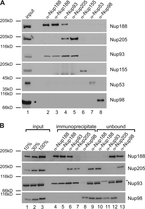 Figure 1. Nup93 forms two distinct complexes. (A) Immunoprecipitations were performed from Xenopus egg cytosol with antibodies against Nup188 (two antibodies raised in different rabbits), Nup93, Nup205, Nup155, and Nup53 and, as a control, Nup98. The indicated proteins were identified by Western blotting with the respective antisera. 10% of starting material (input) was loaded on the left. (B) Quantitative immunoprecipitations were performed from limited amounts of Xenopus egg cytosol with antibodies against Nup188, Nup93, and Nup205 and, as a control, Nup98. Immunoprecipitates and unbound material as well as 10, 30, and 100% of the starting material (input) were analyzed by Western blotting. The Nup93 antibody also recognized a cross-reactivity (asterisk) in the starting and unbound material migrating slightly slower.