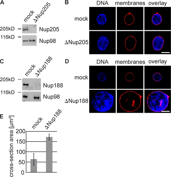 Figure 2. Removal of Nup188–Nup93 enlarges nuclei. (A and C) Western blot analysis of mock- and Nup205–Nup93 (A)- or Nup188–Nup93 (C)-depleted extracts. (B and D) Nuclei were assembled in mock- and Nup205–Nup93 (B)- or Nup188–Nup93 (D)-depleted extracts for 90 min, fixed with 4% PFA and 0.5% glutaraldehyde, and analyzed for chromatin and membrane staining (blue, DAPI; red, DiIC18). (E) Quantitation of the cross-sectional area of mock- and Nup188–Nup93-depleted nuclei of experiments performed as in D. More than 100 randomly chosen chromatin substrates were counted per reaction. The mean of three independent experiments is shown, and error bars represent the total variation. Bars, 20 µm.