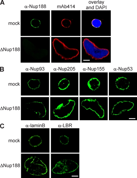Figure 3. Nup188–Nup93-depleted nuclei contain NPCs and INM proteins. (A) Nuclei were assembled in mock- or Nup188–Nup93-depleted extracts for 90 min, fixed with 4% PFA, and analyzed with Nup188-specific antibodies (green) or the monoclonal antibody mAb414, which recognizes FG-repeat nucleoporins (red). Chromatin is stained with DAPI. (B and C) Samples were prepared as in A and analyzed by immunofluorescence with the indicated antibodies. Bars, 20 µm.