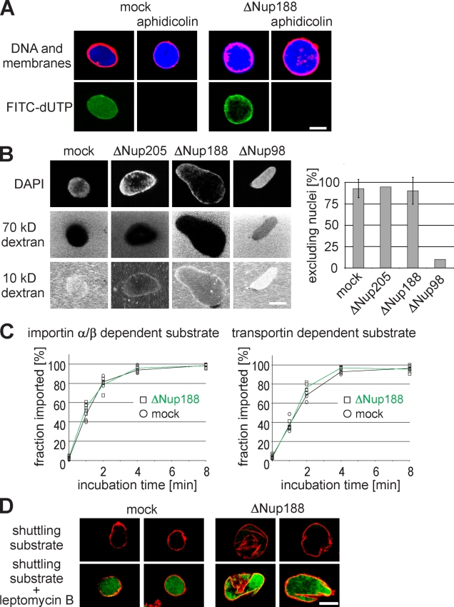 Figure 4. Nuclear functions are unaffected by Nup188–Nup93 depletion. (A) Nuclei were assembled in mock- or Nup188–Nup93-depleted extracts. After 50 min, fluorescently labeled dUTP (green in overlay) and, where indicated, aphidicolin were added. After 90 min, replication was analyzed by confocal microscopy. Membranes were stained with DiIC18 (red), and chromatin was stained with DAPI (blue). (B) Nuclei were assembled in mock-, Nup205–Nup93-, Nup188–Nup93-, and Nup98-depleted extracts. After 90 min, fluorescently labeled 2-MD (not depicted), 70-kD (middle), and 10-kD (bottom) dextrans were added. DNA was stained with DAPI, and samples were analyzed by confocal microscopy. For quantitation, only nuclei with an intact NE (as judged by the exclusion of 2-MD dextrans; >95% of nuclei in each sample) were analyzed. For mock- and Nup188–Nup93-depleted samples, seven independent experiments were analyzed (error bars show the standard deviation), and for Nup205–Nup93- and Nup98-depleted samples, two independent experiments were analyzed. (C) Nuclei were assembled as in A. After 50 min, i.e., when a closed NE had formed, importin α/β– or transportin-dependent reporter substrates containing a TEV cleavage site were added. To assay the nuclear import kinetics of the reporter, NusA-fused TEV protease was added at the indicated time points. Protease cleavage was stopped after 1 min by the addition of SDS sample buffer and boiling. Lines mark the mean of four independent experiments. (D) Nuclei were assembled as in A, and an EGFP-fused shuttling substrate was added. Nuclear export function was inhibited by the addition of 300 nM leptomycin B. Nuclei were isolated and analyzed by confocal microscopy. Membranes are stained with DiIC18 (red). Bars, 20 µm.