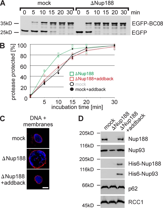 Figure 6. Nup188–Nup93 depletion causes a faster delivery of integral membrane proteins to the INM. (A) Nuclei were assembled in mock- or Nup188–Nup93-depleted Xenopus egg extracts and analyzed by Western blotting. Positions of the uncleaved (EGFP-BC08) and the cleaved (EGFP) reporter are indicated. (B) Quantification from three independent experiments performed as in A. Squares are from Nup188–Nup93-depleted samples (green without and red with the addition of in vitro translated Nup188–Nup93 [addback]), and circles are from mock-treated samples. Lines mark the mean of three independent experiments. (C) The addition of recombinant Nup188–Nup93 rescues the Nup188–Nup93 depletion phenotype. Nuclei were assembled for 120 min in mock- or Nup188–Nup93-depleted extracts without or with the addition of in vitro translated Nup188–Nup93 (addback), fixed with 4% PFA and 0.5% glutaraldehyde, and analyzed for chromatin and membrane staining (blue, DAPI; red, DiIC18). (D) In vitro translated Nup188–Nup93 is incorporated into in vitro assembled nuclei. Nuclei were assembled for 1 h to ensure approximately equal NPC numbers per nucleus, isolated, and analyzed by Western blotting. In vitro translated Nup188 and Nup93 could be also detected using an anti-His6 antibody (third and fourth row). The nucleoporin p62 was detected with mAb414, and the chromatin-binding protein RCC1 serves as a control for equal loading of nuclei. Bar, 20 µm.