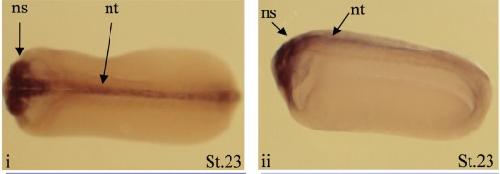 s1pr1 (sphingosine-1-phosphate receptor 1 ) gene expression in Xenopus laevis embryo, assayed via in situ hybridization, NF stage 23, (i) lateral view, anterior left, dorsal up, and (ii) sagittal section, lateral view, anterior left, dorsal up. ( nt=neural tube; ns=nervous system/brain).