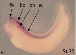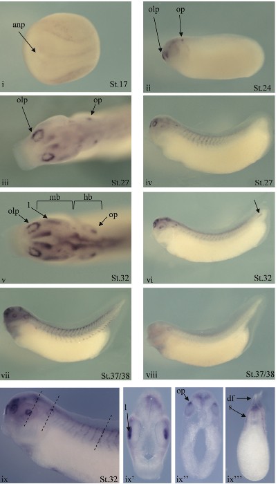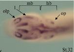 Key: hb: hindbrain; l:lens placode; mb: midbrain; olp: olfactory placode; op: otic placode.