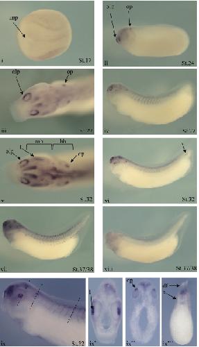 Fig. 5. Embryonic spatial expression profile of S1P genes. Whole mount in situ hybridisation with DIG-labelled RNA probe was performed on embryos from stages 6-41 for S1P genes, except for S1P4. (C) Whole mount in situ hybridisation analysis of S1P5 expression. Anterior view of an embryo at stage 17 (i), lateral view at stage 24 (ii). Details of the head (iii) and lateral view (iv) of a stage 27 embryo. Details of the head (v) and lateral view (vi) of a stage 32 embryo. Lateral views at stage 37/38 of an embryo hybridized with the antisense probe (vii) or with the sense probe (viii). Lateral view of the stained stage 32 embryo (ix) used for the transverse sections (ix ix, ix. The dotted line through the embryo corresponds to plane of the sections. The arrow indicates the expression in the posterior notochord in the tail tip. For lateral views, dorsal is up and anterior is left. anp: anterior neural plate; df; dorsal fin; hb: hindbrain; l:lens; mb: midbrain; olp: olfactory placode; op: otic placode; s: somites.