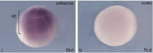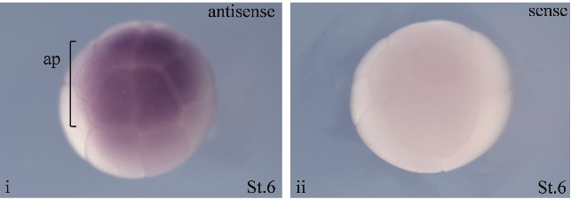 Fig. 6. Embryonic spatial expression profile of the LPA5 gene. Whole mount in situ hybridisation with DIG-labelled antisense (i) and sense (ii) LPA5 probes was performed. Expression was only detected at stage 6 in the animal pole (ap) of the embryos. Animal pole is up.