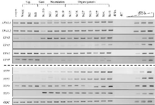 stage tested in this study. Maternal expression of LPA2 de- creases quickly to an almost undetectable level at stage 8 and its zygotic expression is detected from gastrulation throughout de- velopment. LPA5 expression is the highest before MBT but its zygotic transcripts can be amplified until stage 45. Zygotic expres- sion of LPA3 is switched on weakly during neurulation with an increase of expression at stage 37. However, its expression can be weakly detected during gastrulation with an increase of cycle numbers.
