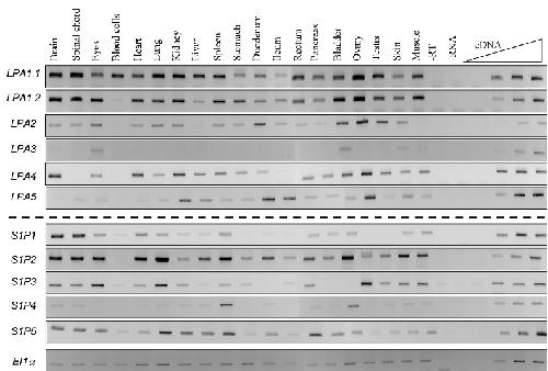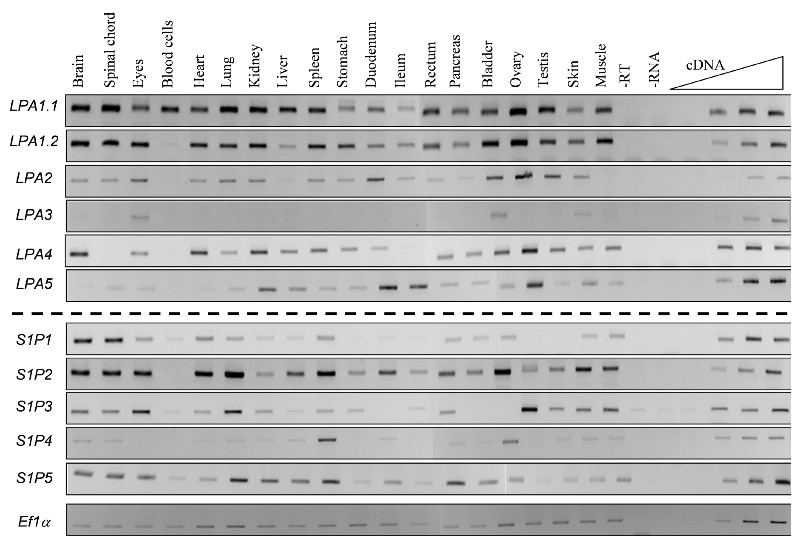 Fig. 8. Spatial expression profile of LPA and S1P families genes in the adult frog. RT-PCR was performed with total RNA extracted from Xeno- pus laevis adult tissues. Each gene of the two families shows a distinct ex- pression pattern. LPA1.1 and LPA1.2 present a similar ubiquitous expres- sion profile. LPA2, 4 and 5 were found expressed in almost all tissues stud- ied whereas the expression of LPA3 is very specific being expressed in only 3 tissues. The S1P family members are also expressed in almost all tissues studied, with the exception of S1P4 which has high levels of expression in spleen and bladder. EF1α was used as a loading control. The linearity was performed with doubling dilutions of cDNA from the following tissues: blad- der for LPA3; brain for S1P1; kidney for LPA1.1, LPA1.2 and LPA2; lung for S1P5; muscle for S1P2; ovary for S1P3, LPA4 and LPA5; spleen for S1P4.