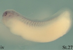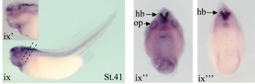 s1pr1 (sphingosine-1-phosphate receptor 1 ) gene expression in Xenopus laevis embryo, assayed via in situ hybridization, NF stage 41, lateral view, anterior left, dorsal up. (ix') sagittal section (ixâ) of the head, (ixââ, ixâââ) transverse sections