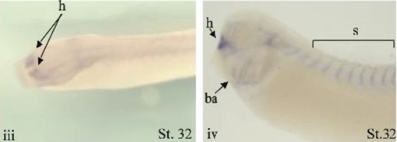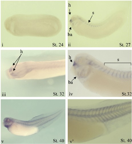 (B) Whole mount in situ hybridisation analysis of S1P2 expression. Lateral view of cleared em- bryos at stage 24 (i), stage 27 (ii). Dorso-lateral view of an uncleared embryo (iii) and lateral view of a cleared embryo (iv) at stage 32. Lateral view of a uncleared embryo at stage 40 (v). Detail of the stained somites of a cleared stage 40 embryo 40 (v. For the lateral views, dorsal is up and anterior is left. ba: branchial arches; h: hypophyseal anlagen; s: somites.
