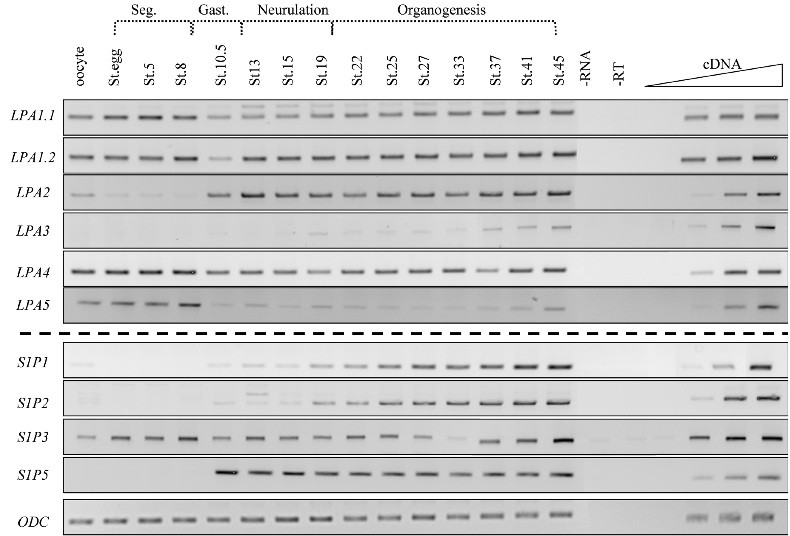 Fig. 4. Temporal expression profile of LPA and S1P families genes. RT-PCR analysis showing expression pattern of the receptor transcripts in Xenopus laevis unfertilised eggs and embryos. Expres- sion of the LPA1.1, LPA1.2, LPA4 and S1P3 genes is constant during develop- ment. Expression of S1P1, 2 and 5 is first detected at stage 10.5 and increases until stage 45, the latest stage tested whereas the expression of S1P5 remains at approximately the same level during development. LPA2 is a maternal gene; its zygotic expression is also switched on at stage 10.5 and expressed until stage 45. Expression of LPA3 can be weakly detected during neurulation and increases until stage 45 whereas LPA5 is expressed at its highest level during maternal stages. S1P4 transcripts cannot be detected in this experiment. ODC was used as a loading control. The linearity was per- formed with doubling dilutions of cDNA from stage 45 embryos except stage 5