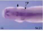 s1pr1 (sphingosine-1-phosphate receptor 1 ) gene expression in Xenopus laevis embryo, assayed via in situ hybridization, NF stage 27, dorsal view, anterior left. (op= otic vesicle, arrow at midbrain-hindbrain boundary).