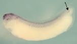 s1pr5 (sphingosine-1-phosphate receptor 5) gene expression in Xenopus laevis embryo, assayed via in situ hybridization, NF stage 32, lateral view, anterior left, dorsal up. Arrow indicates the expression in the posterior notochord in the tail tip.