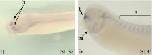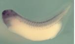 s1pr2 (sphingosine-1-phosphate receptor 2) gene expression in Xenopus laevis embryo, assayed via in situ hybridization, NF stage 40, lateral view, anterior left, dorsal up (left), close up of tail (right)