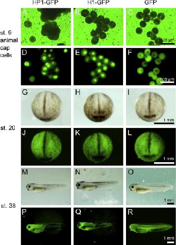 Expression patterns of HP1-GFP and H1-GFP proteins in Xenopus embryos at different stages of development. Images of animal cap cells at stage 9 (A–F), whole embryos at stage 20 (G–L), and tadpoles at stage 38 (M–R). (A–C, G–I, M–O) Bright-field images; (D–F, J–L, P–R) fluorescence images. Embryos were injected with HP1-GFP mRNA (A, D, G, J, M, P), H1-GFP mRNA (B, E, H, K, N, Q) or GFP mRNA (C, F, I, L, O, R). Scale bars: 100 μm (A–F); 1 mm (G–R).