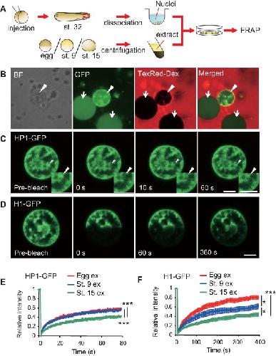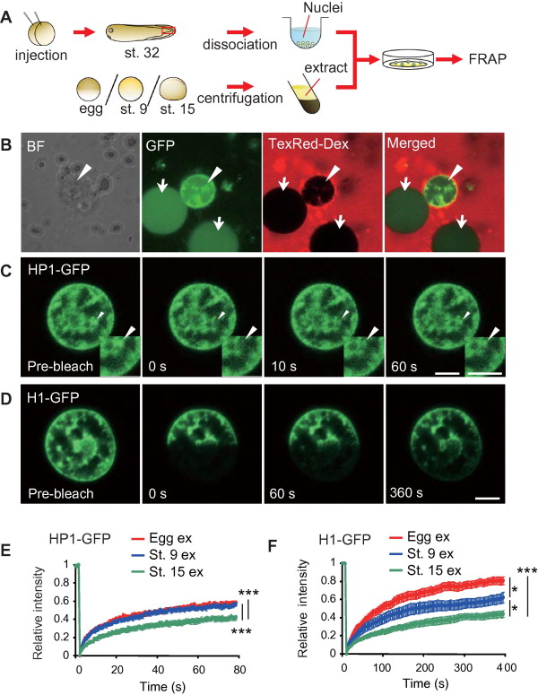 HP1 and H1 fluidities in cytoplasmic extracts at three different developmental stages (A) Schematic of the experimental procedure. Nuclei that expressed HP1-GFP or H1-GFP were isolated from the tailbuds (red rectangle) of stage 32 embryos. Cytoplasmic extracts from eggs, stage 9 embryos, or stage 15 embryos were added and FRAP analyses were conducted. (B) Representative image of an isolated nucleus (arrowhead) that expresses HP1-GFP in balanced salt solution with Texas Red-conjugated dextran. (BF) Bright-field image; (GFP) green fluorescence image; (TexRed-Dex) red fluorescence image; and (Merge) merged image of green and red fluorescence images. The nuclei of intact cells, which were not disrupted during the nuclear isolation procedure (arrows), are not visible due to the yolk-rich cytoplasm. Texas Red-conjugated dextran does not permeate the cellular membranes or nuclear envelopes. (CâF) FRAP experiment with HP1-GFP (C, E) and H1-GFP (D, F). Images taken at 0, 10, and 60 s (C) or at 0, 60, and 360 s (D) in the FRAP sequences. The foci (C, arrowheads) and the lower half (D) of each nucleus were bleached by the laser at time zero. Scale bar: 5 μm. Each inset in (C) contains a higher-magnification image. (E, F) Normalized FRAP recovery curves for the foci in (C) and the lower half of (D), respectively. The fluorescence intensities before and just after bleaching were defined as 1 and 0, respectively. Error bars, SE; âP < 0.05; âââP < 0.0005 (t-test; n = 45 for egg extract, n = 38 for stage 9embryo extract, and n = 39 for stage 15embryo extract in (E); n = 9 for egg extract, n = 11 for stage 9embryo extract, and n = 13 for stage 15embryo extract in (F)).