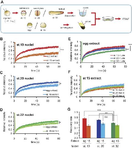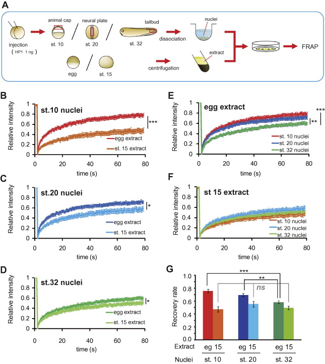 HP1-GFP fluidities in three types of isolated nuclei treated with two types of cytoplasmic extracts. (A) Schematic of the experimental procedure. Nuclei that express HP1-GFP were collected from the animal cap cells of stage 10 embryos, neural plates cells of stage 20 embryos, and tailbud cells of stage 32 embryos. Extracts from eggs or stage 15 embryos were added, and FRAP measurements were conducted. (BâD) Normalized FRAP curves of the HP1 fluidities in egg extracts and stage 15embryo extracts in nuclei of stage 10animal cap cells (B), stage 20neural plate cells (C), and stage 32tailbud cells (D). (E, F) Normalized FRAP curves of the HP1 fluidities in 10 animal cap cell nuclei, stage 20neural plate nuclei, and stage 32tailbud nuclei in egg extract (E) and in stage 15embryo extracts (F). (G) Recovery rates (see Section 2) for each condition. Error bars represent the SE. âP < 0.05, ââP < 0.005, âââP < 0.0005 (two-sample t-test; n = 31 for the egg extract, n = 24 for the stage 15embryo extract (B); n = 33 for the egg extract, n = 28 for the stage 15embryo extract (C); n = 34 for the egg extract, n = 36 for the stage 15embryo extract (D)).
