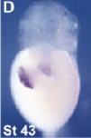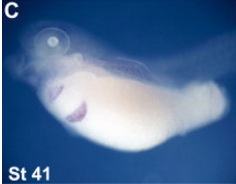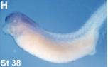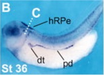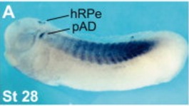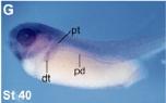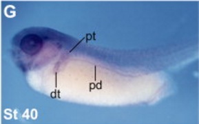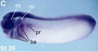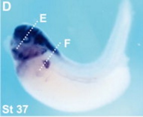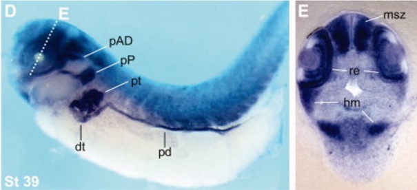 gene expression in Xenopus laevis embryo, assayed via in situ hybridization, NF stage 37 & 38, lateral view, anterior left, dorsal up.
