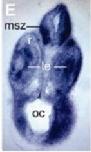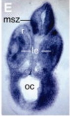 Figure 4. sfxn1 expression revealed by whole-mount in situ hybridization. A,B: Dorsal and anterior views. C,D: Lateral view. E,F: Transverse sections of a stage 37 embryo at the levels illustrated by the dashed lines in D. G: Lateral view. The brown signals in the eye are un-bleached pigments. Dashed line was used to demarcate the boundary between the liver and the ventral pancreatic bud. H: Dorsal view. I: Ventral view. ba, branchial arches; dp, dorsal pancreatic bud; ey, eye; le, lens epithelium; li, liver; msz, marginal and subventricular zones of the midbrain and neural tube; nc, notochord; oc, oral cavity; ot, otic vesicle; pa, pancreas; pP, posterior lateral line placodes; pr, pronephric anlage; pt, pronephric proximal tubules; r, retina; vp, ventral pancreatic bud.
