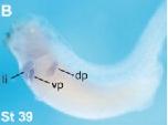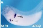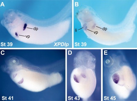 Figure 3. The embryonic expression of sfxn2 in comparison to XPDIp revealed by whole-mount in situ hybridization. A: Lateral view showing XPDIp expression. B-E:sfxn2 expression. B,C: Lateral view. D,E: Ventral view. Dashed line in B was used to demarcate the boundary between the liver anlage and the ventral pancreatic bud. dp, dorsal pancreatic bud; vp, ventral pancreatic bud; li, liver anlage.