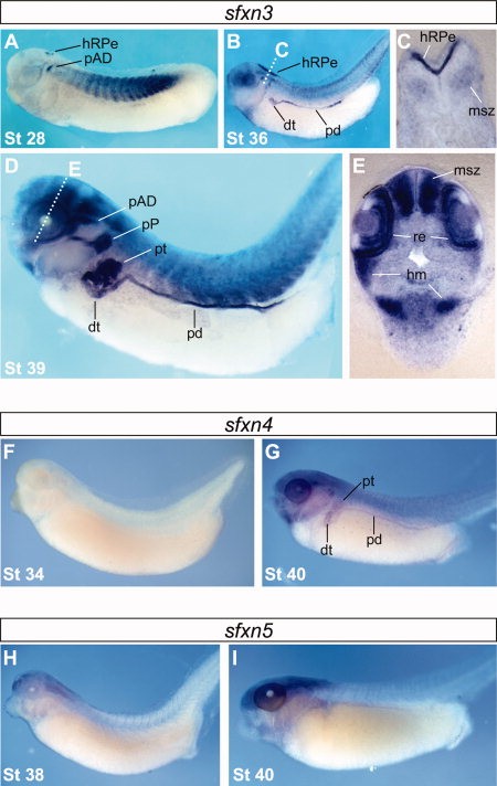 Figure 5. Whole-mount in situ hybridization data on sfxn3,4,5 expression. A,B: Lateral view. C: Transverse section of a stage 36 embryo at the level illustrated by the dashed line in B. Note that due to a technical reason, the roof of the hindbrain collapsed during the fixation step for the whole-mount in situ hybridization analysis. D: Lateral view. E: Transverse section of a stage 39 embryo at the level illustrated by the dashed line in D. FâI: Lateral view. dt, pronephric distal tubules; hm, head mesenchyme; hRPe, hindbrain roof plate epithelium; msz, marginal and subventricular zones of the midbrain; re, retina; pAD, anterodorsal lateral line placode; pd, pronephric duct; pP, posterior lateral line placode; pt, pronephric proximal tubules.