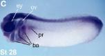sfxn3 () gene expression in Xenopus laevis embryo, assayed via in situ hybridization, NF stage 28, lateral view, anterior left, dorsal up.