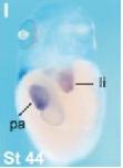 sfxn1 () gene expression in Xenopus laevis embryo, assayed via in situ hybridization, NF stage 44, lateventralal view, dorsal up.