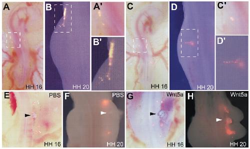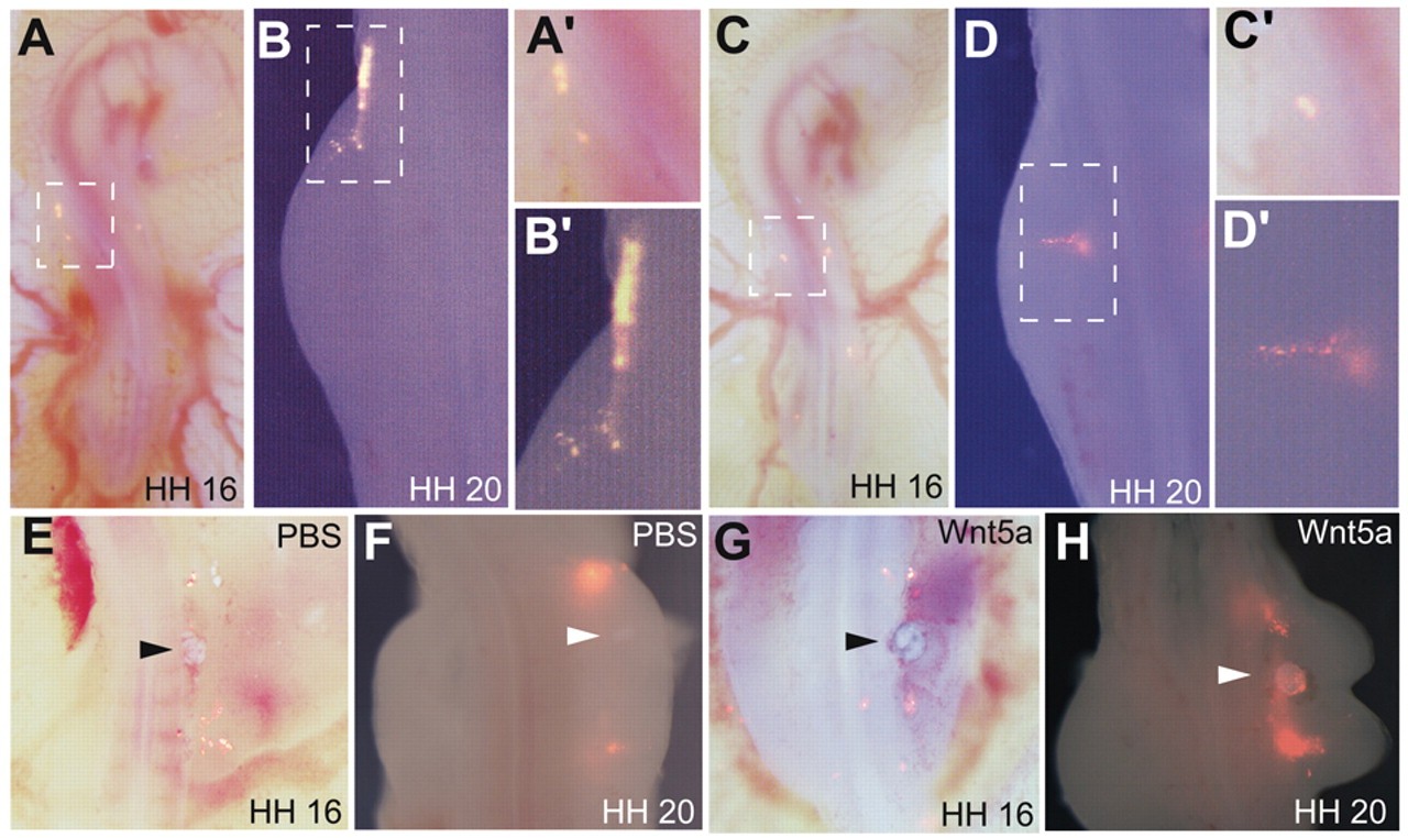Fig. 2. Regional lineage of chick lateral plate mesoderm during early wing bud outgrowth. Merged bright-field and fluorescent images. (A,Aâ²) Chick embryo labelled with spots of DiI (orange) at HH 16 (26-28 somites) at the start of wing bud outgrowth and cultured in ovo. The rostral-most spots on the left side are adjacent to somites 17/18. (B,Bâ²) In the same embryo at HH 20, DiI-labelled tissue has become displaced into the wing bud. Streaks of DiI suggest caudal-lateral oblique movement of mesoderm into the anterior wing bud from a rostral position. (C-Dâ²) Lineage tracing in another embryo with images taken before (C,Câ²) and after (D,Dâ²) culture in ovo. DiI spots adjacent to somites 19/20 at HH 16/17 (C,Câ²) were displaced in a linear fashion by HH 20, heading directly lateral (D,Dâ²). These findings are consistent with the movements observed in the mouse embryo, as shown in Fig. 1. (E-H) Pre- and post-culture images showing that chemoattraction of DiI-labelled mesoderm is not apparent toward a bead (arrowheads) soaked in PBS (E,F), but is apparent toward a bead soaked in Wnt5a protein in PBS (G,H). |