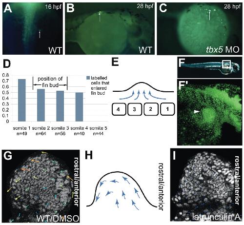 Fig. 3. Lineage and movement of mesoderm during early pectoral fin development in zebrafish. (A) Fluorescein uncaged in the lateral plate mesoderm (arrow) at 16 hpf (18 somites). (B) By 28 hpf (30 somites), in the same embryo as in A, focal fluorescence is found in the early fin bud (arrow). (C) In tbx5 morpholino (MO) knockdown embryos, a fin bud fails to form and labelled tissue becomes scattered throughout the mesoderm (arrow). (D) Summary of lateral plate lineage-tracing experiments. Mesoderm adjacent to somites 1 to 4, but not 5, contributes to the pectoral fin bud. (E) Since the pectoral fin bud arises adjacent to somites 2 and 3, we infer that lateral plate mesoderm condenses during fin initiation. (F,Fâ²) Field of view (boxed) and position of a maturing pectoral fin bud at 44 hpf (arrowhead), positioned as in G-I. (G) VVF of an h2af/z:gfp transgenic embryo at 44 hpf. (H) Schematic representation of tissue movements in the maturing (35-45 hpf) fin bud. The movements are comparable to those of the mouse limb bud, taking into account the different orientation of the two buds with respect to the embryo body. (I) VVF of a 44 hpf embryo treated with 4 μM latrunculin A. Tissue motion is halted (but not with 0.1% DMSO carrier) as demonstrated by the lack of arrows under PIV analysis. |