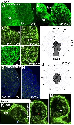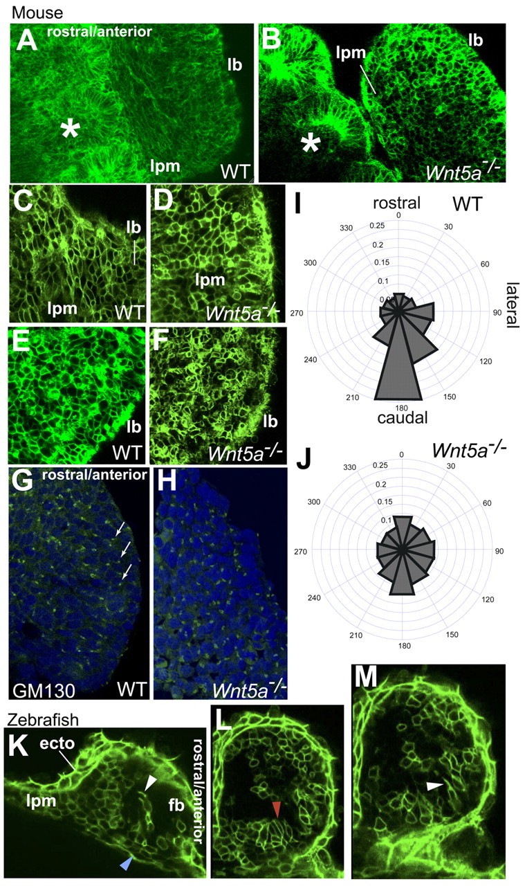 Fig. 4. Regional differences in cell shape during early limb bud outgrowth. (A-F) Theiler stage 15 (21-25 somites) CAG::myr-Venus transgenic mouse embryos imaged live using a confocal microscope. Rostral positions are towards the top of the images. Somites, which contain cells of distinctive shape for comparison, are indicated by asterisks (A,B). WT lateral plate mesoderm (lpm) cells adjacent to the early limb bud are oriented longitudinally, parallel to the rostrocaudal axis of the embryo. This is observed as longitudinal streaking adjacent to the somites in A, and anteromedial to the early limb bud in C. Cells within the early WT limb bud (lb) are isotropic (A,C,E). By contrast, cells in Wnt5aâ/â littermates (B,D,F) are isotropic in both the lateral plate and the limb bud. This finding correlates with the shortening and relative lack of tissue movement observed in Wnt5aâ/â lateral plate mesoderm. (G,H) GM130 (Golga2) stain (green) highlights the location of the Golgi relative to nuclei (DAPI, blue). In Theiler stage 14 embryos (20 somites), Golgi are commonly found caudal and lateral to corresponding nuclei in the WT forelimb mesoderm field (arrows), but not in Wnt5aâ/â mutants. Since Golgi are found at the leading edge of motile cells, these data correlate well with the direction of tissue motion in WT embryos, and the lack of movement of Wnt5aâ/â mesoderm demonstrated in Fig. 1. (I,J) Polar plots summarising Golgi angle in relation to the nuclear centre, with embryonic reference marks as shown. (K-M) Separate z-stacks of a live βactin:hras-egfp transgenic zebrafish fin bud at 42 hpf. Lpm cells at the base of the fin bud (blue arrowhead, K) are elongated, parallel to the rostrocaudal axis of the embryo. Most cells in the fin bud are isotropic. However, cells in the proximal-anterior region of the fin bud are elongated, with an anteroproximal-to-posterodistal long axis, parallel to their direction of movement (red arrowhead, L). Some of these cells exhibit protrusions at their posterodistal tip (white arrowheads, K,M). ecto, ectoderm; lpm, lateral plate mesoderm; lb, limb bud; fb, fin bud. |