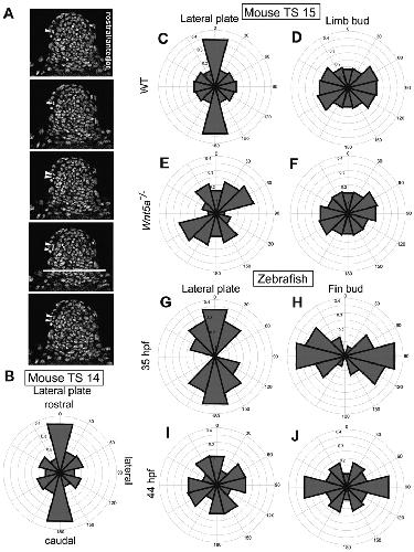 Fig. 5. Evidence for regionally localised oriented cell division during early limb development in mouse and zebrafish. (A) Method of measuring cell division angle. h2af/z:gfp transgenic zebrafish chromatin undergoing mitosis (arrowheads) is visualised on successive frames. The angle of a line joining the daughter chromatin centres at telophase is measured with reference to the longitudinal axis of the lateral plate mesoderm (fourth frame down). The level at which the limb bud protruded beyond the lateral plate was selected as the boundary between these two regions on every individual z-stack (long white line, fourth frame down). Every mitotic angle visualised on all z-stacks, together encompassing the entire limb bud, was measured over the whole duration of each time-lapse experiment. (B-J) Polar plot representations of cell division planes in which the rostrocaudal axis is defined at 0/180°, and the lateral and future distal axis of the limb bud is defined at 90°. The proportion of cell divisions in each 30° segment is represented by the length of the segment. (B) During mouse Theiler stage 14 (18 somites), lateral plate mesoderm adjacent to somites 8-12 exhibits a preferential plane of cell division that is parallel to the rostrocaudal embryo axis. At Theiler stage 15 (21-25 somites), although the same preferential plane of division is found in the lateral plate (C), cells in the early limb bud exhibit a different orientation of division that is perpendicular to the rostrocaudal axis, but parallel to the direction of bud outgrowth (D). In Wnt5aâ/â mutants, orientation of cell division in the lateral plate is less apparent (E), although some orientation in the limb bud is evident (F). This finding correlates with the severe shortening and lack of tissue movement in the lateral plate mesoderm of Wnt5aâ/â mutants, whereas budding of the limbs takes place with evident cell movement, as seen in Fig. 1. In zebrafish at 35 hpf, the orientation of cell division is similar to that of the mouse embryo (G), although more pronounced in the limb bud (H). By 44 hpf, orientation of cell division in the lateral plate is lost (I), while it persists in the fin bud (J). |