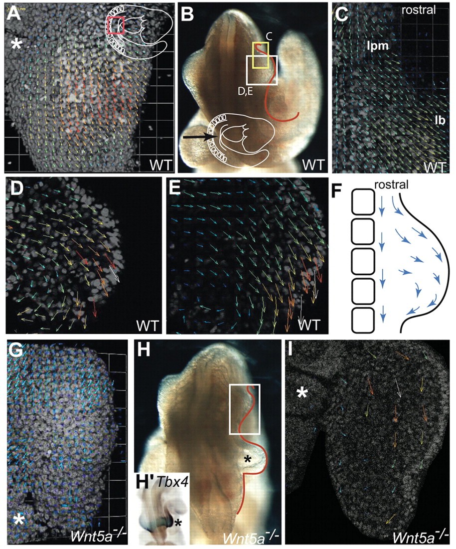 Fig. 1. Mesoderm trajectories during mouse early limb outgrowth. For vector velocity fields (VVFs), longer arrow length and red end of the spectrum correlate with higher relative velocity within a given experiment. (A) VVF of lateral plate mesoderm adjacent to somites 8-12 of a CAG::H2B-EGFP transgenic embryo at late Theiler stage 14 (E9.0-9.25, 18-20 somites), just prior to limb outgrowth. Rostral-to-caudal tissue movement relative to a stationary somite boundary (asterisk) is evident. Inset depicts field of view. (B) Dorsal view of early forelimb buds of a Theiler stage 15 (E9.25-9.5, 21-25 somites) wild-type (WT) embryo. The inset and arrow depict the direction of view; the orange line indicates the margin of the right-hand side lateral plate mesoderm. The hindlimb bud is beyond the field of view. The boxed regions indicate the field of view in C-E. (C) VVF of the anterior margin of a early WT limb bud at Theiler stage 15. Mesoderm moves obliquely from lateral plate mesoderm (lpm) toward the limb bud (lb). (D,E) Separate z-stacks of a Theiler stage 15 WT forelimb bud. Within the early limb bud, mesoderm moves in a posterodistal direction. Tissue near the posterior margin rotates in a proximal direction. (F) Schematic depiction of regional tissue vectors during early limb outgrowth. (G) Lateral plate mesoderm of Wnt5aâ/â;CAG::H2B-EGFPTg/+ at Theiler stage 14 lacks the coordinated movement seen in the WT embryo (A). Asterisk overlies somite. (H) The long-body axis and lateral plate mesoderm of a Wnt5aâ/â;CAG::H2B-EGFPTg/+ embryo at Theiler stage 15 are shortened as compared with the WT embryo (B). The orange outline delineates the truncated lateral plate mesoderm and the hindlimb bud (*), which is in abnormally close proximity to the forelimb bud. (Hâ²) Expression ofTbx4 by in situ hybridisation confirms that the bulge close to the forelimb is indeed the hindlimb. The forelimb (boxed region) is shown in I. (I) Tissue movement into the early Wnt5aâ/â;CAG::H2B-EGFPTg/+ limb bud is evident, albeit at a lower velocity, compared with WT embryos (see text). |