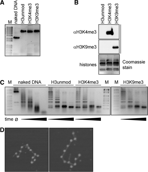 Figure 2. Analysis of reconstituted oligonucleosomes. (A) Native agarose gel (0.5%, 0.2× TBE) of free DNA or oligonucleosomes after reconstitution on 12 × 200 × 601 sequence containing uniformly the indicated H3 species. Gel was stained post-running with ethidium bromide (M, molecular size markers). (B) Reconstituted oligonucleosomes containing the indicated H3 species were run on SDS PAGE gel and analyzed by western blotting using the indicated antibodies. A separately run gel was stained with Coomassie blue. (C) DNA used for reconstitution or assembled oligonucleosomes containing different H3 species were digested with MNase for varying times. Samples were run on agarose gels (1.5%, 1× TBE) and stained with ethidium bromide (M, molecular size markers). (D) Scanning force microscopy images of reconstituted oligonucleosomes. At a 1.1 : 1 octamer : DNA ratio the number of visible nucleosomes on one DNA molecule typically ranged from 10 to 12.