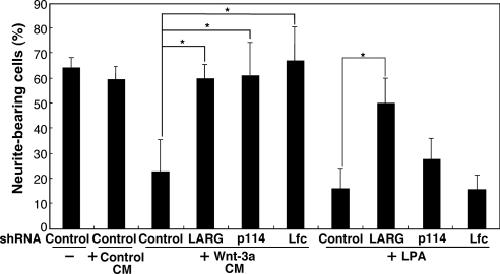 Figure 3. Effects of knockdown of LARG, p114-RhoGEF, or Lfc on neurite retraction induced by Wnt-3aCM or LPA. N1E-115 cells were cotransfected with CFP and LARG, p114-RhoGEF, or Lfc shRNA at the ratio of 1:5 and serum-starved for 24 h. Cells were treated for 10 min with control (L cell) CM, Wnt-3aâproducing L cell CM, or LPA. The percentages of neurite-bearing cells in CFP-positive cells were counted. Data represent means ± SD of three independent experiments (at least 50 cells in each experiment). *p < 0.01.