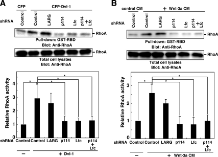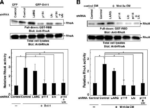 Figure 4. Effects of single knockdown of LARG, p114-RhoGEF, or Lfc, or double knockdown of p114-RhoGEF and Lfc, on RhoA activation induced by Dvl-1 (A) or Wnt-3a (B). In A, N1E-115 cells were cotransfected with CFP or CFP-Dvl-1 and shRNA constructs, cultured for 24 h, and serum-starved for 24 h. In B, N1E-115 cells transfected with shRNAs were cultured for 24 h, serum-starved for 24 h, and treated with control or Wnt-3aCM for 10 min. The level of active RhoA was analyzed by a GST-RBD pull-down assay. Relative activity of RhoA was normalized by the immunoblot intensity of RhoA in the total cell lysates. Data represent means ± SD of three independent experiments, with the level in control cells taken as 1.0. *p < 0.01.