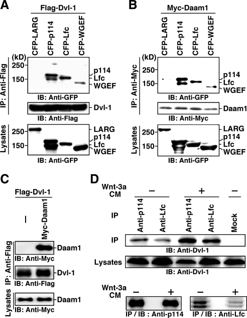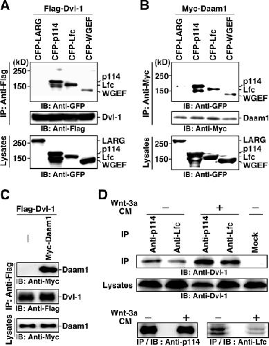Figure 5. Binding of p114-RhoGEF, Lfc, and WGEF, but not LARG, to Dvl and Daam1. (A) Binding to Dvl. Flag-tagged Dvl-1 was coexpressed with CFP-tagged Rho-GEFs in HEK293 cells. Cell lysates were immunoprecipitated with an anti-Flag antibody and immunoblotted with anti-GFP and anti-Flag antibodies. (B) Binding to Daam1. Myc-tagged Daam1 was coexpressed with CFP-tagged Rho-GEFs in HEK293 cells. Cell lysates were immunoprecipitated with an anti-Myc antibody and immunoblotted with anti-GFP and anti-Myc antibodies. (C) Binding of Daam1 to Dvl. Myc-Daam1 and Flag-Dvl-1 were coexpressed in HEK293 cells. Cell lysates were immunoprecipitated with an anti-Flag antibody and analyzed by immunoblotting with anti-Myc and anti-Flag antibodies. (D) Binding of endogenous proteins. N1E-115 cells were serum-starved for 24 h and treated with Wnt-3aCM for 10 min or left untreated. Cell lysates were immunoprecipitated with an antiâp114-RhoGEF or an anti-Lfc antibody and immunoblotted with antiâDvl-1, antiâp114-RhoGEF, and anti-Lfc antibodies. All experiments were repeated twice, and similar results were obtained.