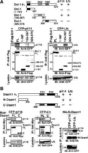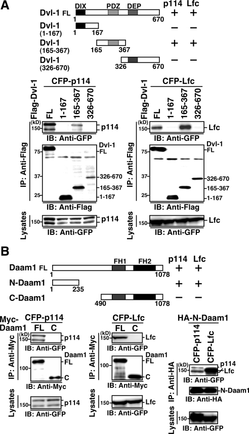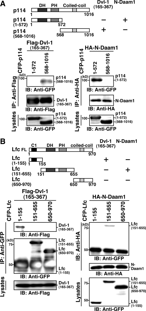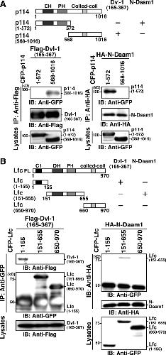 Figure 7. Mapping of the binding regions of p114-RhoGEF and Lfc. (A) Binding of p114-RhoGEF fragments to Dvl-1 and Daam1. CFP-tagged p114-RhoGEF fragments were coexpressed with Flag-Dvl-1-(165-367) or HA-N-Daam1 in HEK293 cells. Cell lysates were immunoprecipitated with an anti-Flag or an anti-HA antibody and analyzed by immunoblotting with an anti-GFP antibody. (B) Binding of Lfc fragments to Dvl-1 and Daam1. CFP-tagged Lfc fragments were coexpressed with Flag-Dvl-1-(165-367) or HA-N-Daam1 in HEK293 cells. Cell lysates were analyzed as in A. Schematic structures of p114-RhoGEF, Lfc, and their fragments are shown.