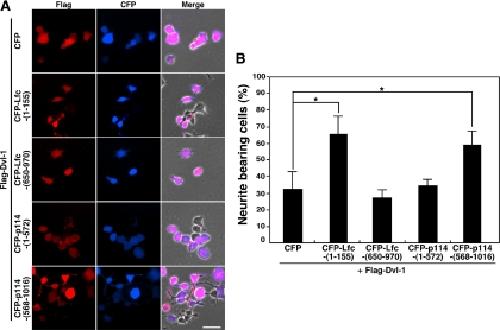 Figure 8. The Dvl-binding fragment of p114-RhoGEF or Lfc suppresses Dvl-induced neurite retraction. (A) Effects of expression of p114-RhoGEF or Lfc fragments on Dvl-induced neurite retraction. N1E-115 cells were cotransfected with Flag-Dvl-1 and CFP or CFP-tagged p114-RhoGEF or Lfc fragments, cultured for 24 h, and serum-starved for 24 h. Cells were then fixed and immunostained with an anti-Flag antibody. Merged images of phase-contrast, anti-Flag immunostaining (red), and CFP fluorescence (cyan) are shown in the right. Scale bar, 50 μm. (B) Quantitative analysis of the percentage of neurite-bearing cells. Data represent means ± SD of three independent experiments (at least 50 cells in each experiment). *p < 0.01.
