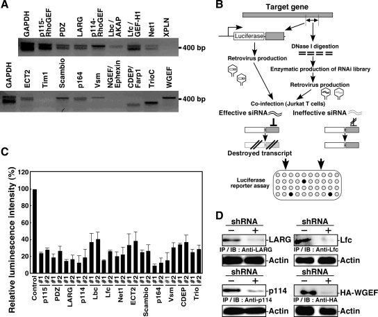 Figure 1. Screening of effective shRNA constructs targeting Rho-GEFs expressed in N1E-115 cells. (A) Expression of Rho-GEF mRNAs in N1E-115 cells. Total RNAs from N1E-115 cells were subjected to RT-PCR analysis using primers designed to amplify PCR products of ∼400 base pairs in length. Experiments were repeated twice, and similar results were obtained. (B) Schematic of the protocol for selecting effective shRNA constructs. The cDNA fragment (∼400 base pairs) of a target gene is fused to the 3′ terminus of luciferase cDNA and infected into Jurkat cells together with each individual shRNA construct from an RNAi library constructed by an EPRIL method. Effective shRNA constructs target the cognate sequences of the target gene on the luciferase-target chimeric mRNA, thus preventing luciferase expression. (C) Luciferase reporter analysis to select shRNA constructs targeting each of 13 Rho-GEFs. Jurkat cells were coinfected with retroviruses carrying a luciferase-target chimeric gene together with retroviruses carrying shRNA constructs targeting each Rho-GEF. The relative luminescent intensity for each type of shRNA-infected cells was compared with that for shRNA noninfected control cells. Data represent means ± SD of triplicate experiments. The target sequences for Rho-GEFs are listed in Supplemental Table S2. (D) Immunoblot analysis of Rho-GEF expression. N1E-115 cells were transfected with the indicated shRNA (#1) and cultured for 48 h. Expression of endogenous Rho-GEF proteins or cotransfected HA-WGEF was analyzed by immunoprecipitation (IP) followed by immunoblotting (IB) with the indicated antibodies. Actin in cell lysates was analyzed as a loading control.