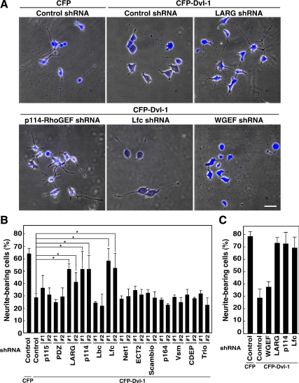Figure 2. Knockdown of LARG, p114-RhoGEF, or Lfc, but not WGEF, suppresses Dvl-induced neurite retraction. (A) Effects of Rho-GEF knockdown on Dvl-induced neurite retraction. N1E-115 cells were cotransfected with CFP-Dvl-1 (or control CFP) and the indicated shRNA plasmids at the ratio of 1:2, cultured for 24 h, serum-starved for 24 h, and then fixed. Merged images of phase-contrast and CFP fluorescence are shown. Scale bar, 50 μm. (B) Quantitative analysis of the percentage of neurite-bearing cells. Cells with neurites exceeding one cell body length were scored and expressed as a percentage of the total number of CFP-positive cells. Data represent means ± SD of three independent experiments (at least 50 cells in each experiment). *p < 0.01. (C) Effects of WGEF shRNA and the indicated shRNA (#1) on Dvl-induced neurite retraction. Quantitative analysis of the percentage of neurite-bearing cells was performed as in (B).