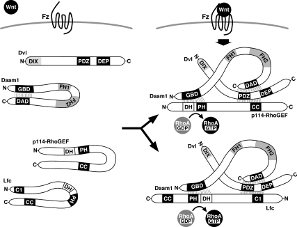 Figure 9. A model for the Wnt-3aâ and Dvl-induced RhoA activation. Wnt-3a induces the formation of a ternary complex, composed of Dvl-1, Daam1, and p114-RhoGEF or Lfc, which in turn stimulates RhoA activation and neurite retraction. Details are described in text.