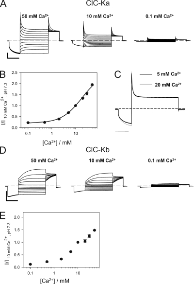 Figure 1. Ca2+ext dependence of ClC-Ka and ClC-Kb. (A) Typical currents of ClC-Ka evoked by the standard IV-pulse protocol at different Ca2+ concentrations as indicated, at pH 7.3. (B) Effect of [Ca2+]ext on ClC-Ka (circles; n = 9). Current at 60 mV acquired at different conditions was normalized to values measured in standard solution (I/I10 mM Ca2+, pH 7.3) and plotted versus [Ca2+]ext (used concentrations: 0.1, 0.5, 2, 5, 10, 20, 30, and 50 mM). The line represents the fit obtained using Eq. 2 as described in Results. (C) Superimposed traces measured at 60 mV at 5 mM [Ca2+]ext (black line) and at 20 mM [Ca2+]ext (gray line) measured from the same oocyte. Currents were scaled to the steady-state current at 60 mV. Horizontal bar, 200 ms. (D) Typical currents of ClC-Kb measured at different Ca2+ concentrations as indicated. (E) Effect of [Ca2+]ext (concentrations as in B) on ClC-Kb (squares; n = 5). Horizontal bars, 200 ms. Vertical bars, 5 µA.
