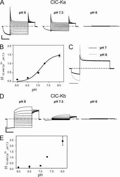 Figure 2. pHext dependence of ClC-Ka and ClC-Kb. (A) Voltage clamp traces of ClC-Ka measured at different pH as indicated, in 10 mM [Ca2+]ext. (B) Effect of pHext on ClC-Ka (circles; n = 7). Normalized currents were calculated as for Fig. 1. I/I10 mM Ca2+, pH 7.3, is plotted versus pH. The line represents the fit obtained using Eq. 1 as described in Results. (C) Superimposed traces measured at pH 7.0 (black line) and pH 8.0 (gray line) measured from the same oocyte. Currents were scaled to the steady-state current at 60 mV. Horizontal bar, 200 ms. (D) Traces of ClC-Kb measured at different pH as indicated, in 10 mM [Ca2+]ext. (E) Effect of pHext on ClC-Kb (squares; n = 4). Horizontal bars, 200 ms. Vertical bars, 5 µA.